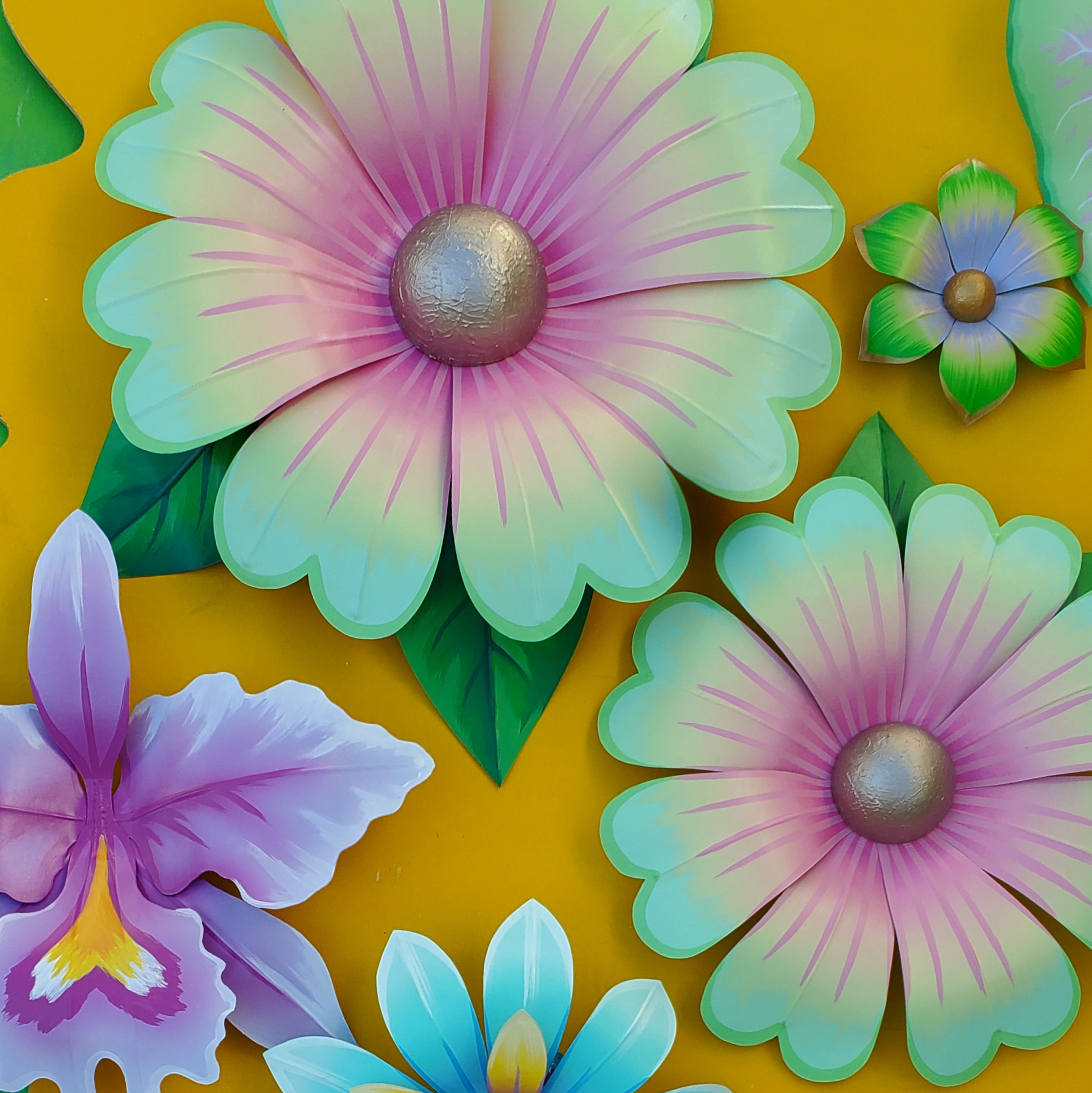 All flowers and butterflies are made of paper and wire, the same way they are traditionally crafted for New Orleans’ Mardi Gras parades. They are not waterproof and should be kept safe from rain and direct sun. Each flower comes with hanging hardware attached on the back. For hanging tips, please visit my flower hanging and care page!