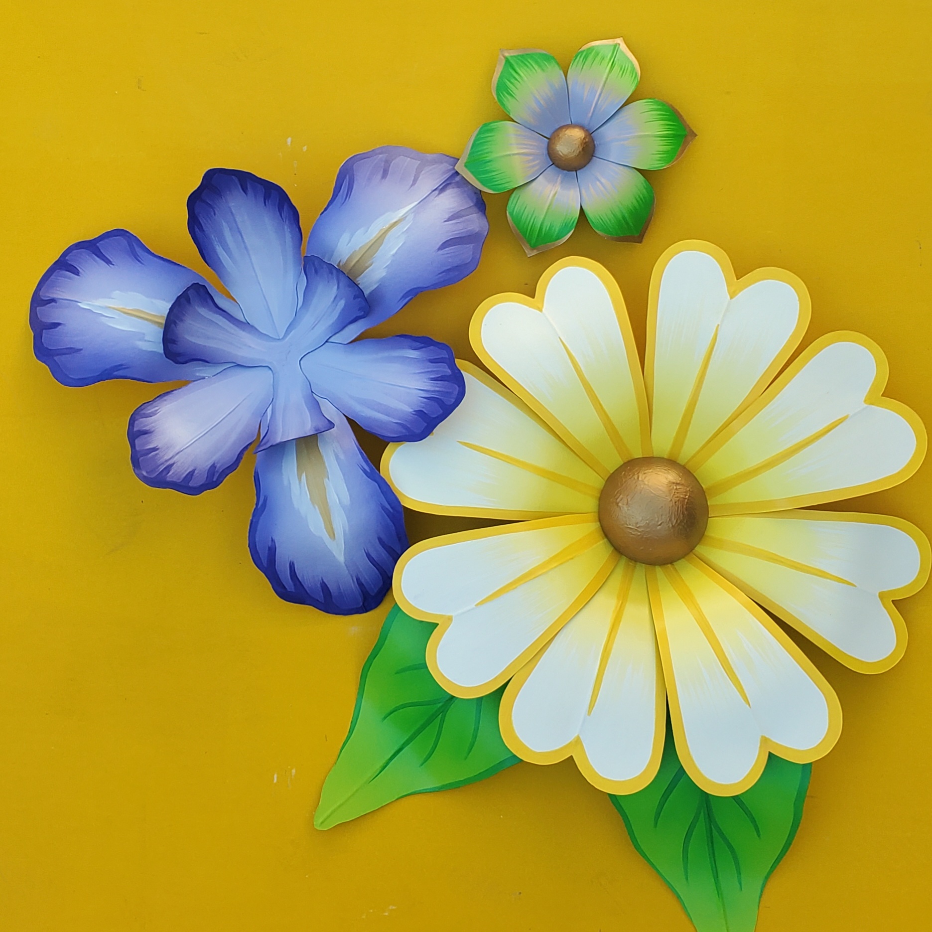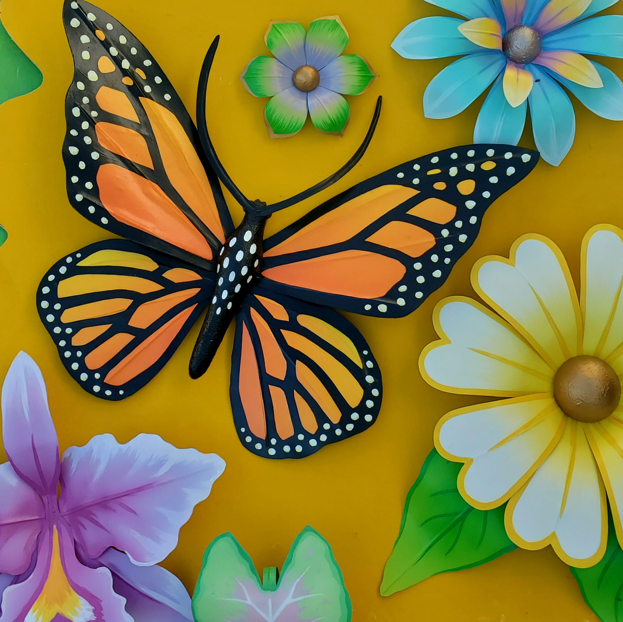 All flowers and butterflies are made of paper and wire, the same way they are traditionally crafted for New Orleans’ Mardi Gras parades. They are not waterproof and should be kept safe from rain and direct sun. Each flower comes with hanging hardware attached on the back. For hanging tips, please visit my flower hanging and care page!