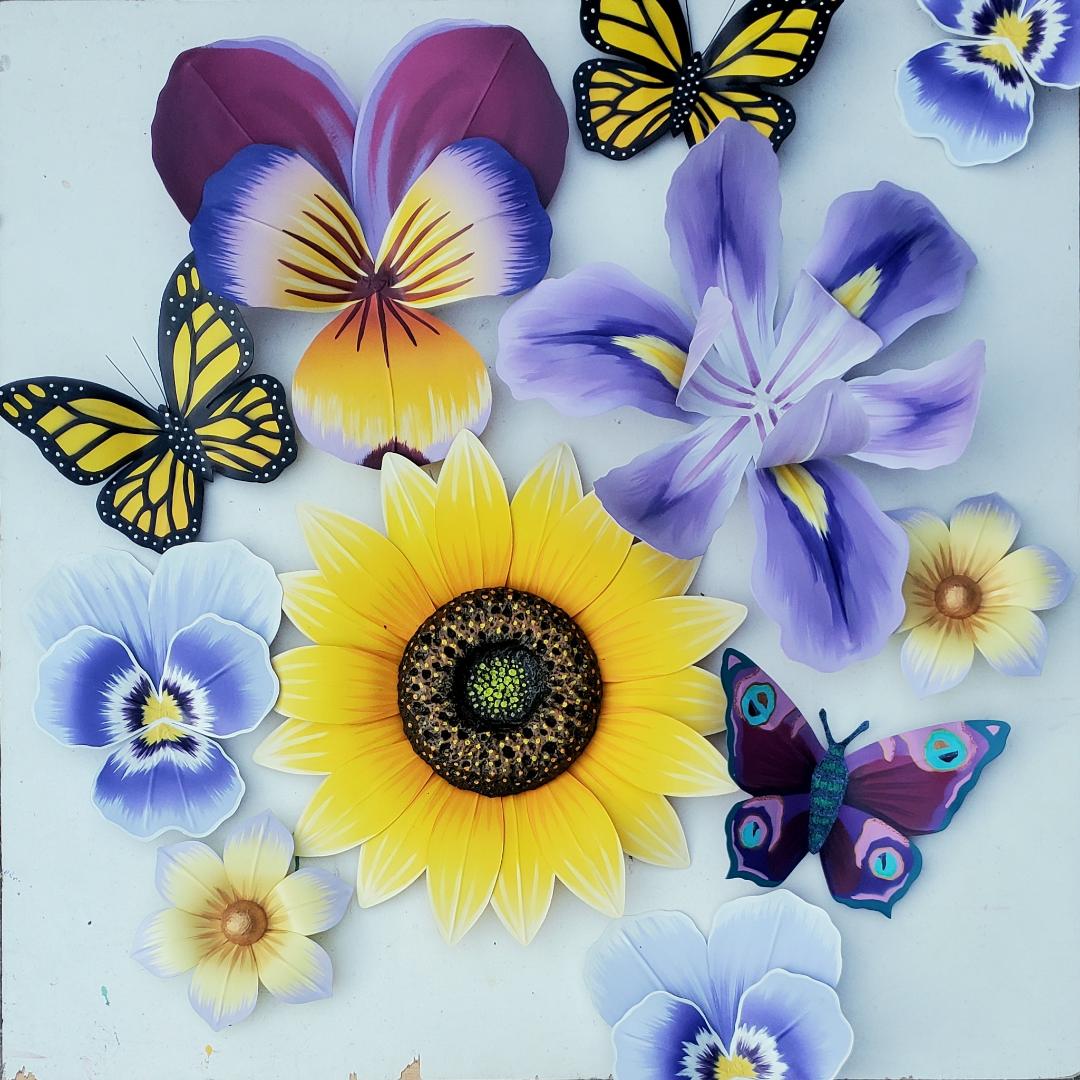 All flowers and butterflies are made of paper and wire, the same way they are traditionally crafted for New Orleans’ Mardi Gras parades. They are not waterproof and should be kept safe from rain and direct sun. Each flower comes with hanging hardware attached on the back. For hanging tips, please visit my flower hanging and care page!